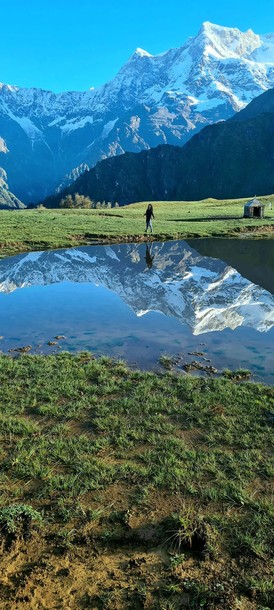 Today's trek takes you to the summit of this Madmaheshwar trek package, which offers not only pristine views but has a spiritual connection as well. The trek starts from Goundar village that is gradual in the starting but becomes a bit steep yet moderate later on. This well- paved trail passes through dense forests to small villages and amazes you with the stunning elegance of lush greens and rustic lifestyle. After trekking for 1 km from Gaundhar, you witness the unmatched beauty of the Madmaheshwar Ganga, dense forests, and reach the small Bantoli village. Here, you discover the confluence of Mourkhanda River coming from Chaukhamba, and River Madmaheshwari descending from Nandikund, known as the Madmaheshwar Ganga. The trail runs through this verdant Bantoli village and, afterward, a continuous ascent takes to upper-Bantoli. Now an arduous trek takes to the final destination of the Madmaheshwar Valley, where the famous holy shrine is on the left. The mountain at the backdrop of the temple is the Buda-Madmaheshwar peak where you can reach after a difficult trek of 2 km in 2 hrs. The views of the surrounding mountains through this difficult terrain are extraordinary and enforce the trekkers to visit the place again and again. The Buda-Madmaheshwar has four stunning pools that reflect the unparalleled images of the surrounding mountain ranges. You get back to Madmaheshwar Valley before the dark and stay overnight in a tent or the temple’s Dharamshala.